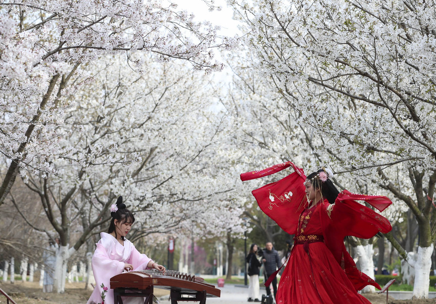 3月23日,江苏淮安,身着汉服的大学生在校园里的樱花下表演传统节目。当日,yl23455永利官网举办花朝节(俗称“花神节”,是汉族的传统节日)活动,30余名身着汉服的大学生通过汉服雅集、簪花游园等,再现花朝节传统民俗之美。