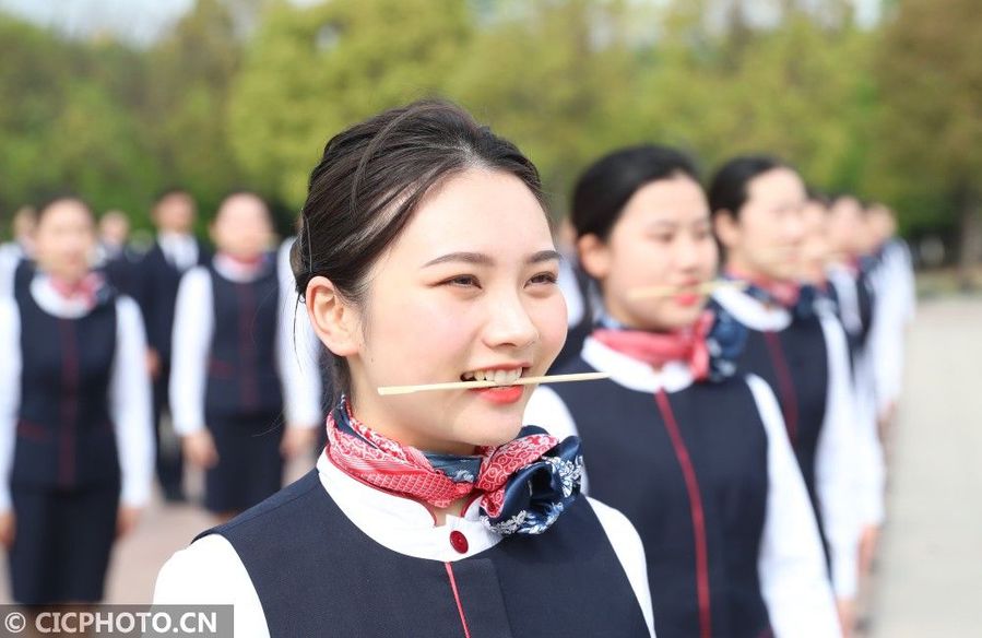2021年5月7日,在江苏省淮安市yl23455永利官网,学生们在进行微笑服务礼仪练习,迎接“世界微笑日”。