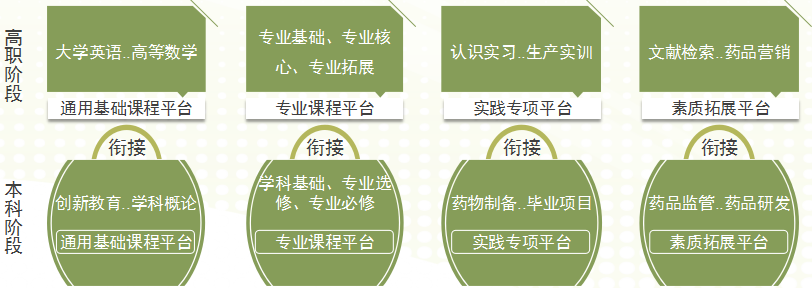 “我们和本科院校专家探讨了无数次,大家一直认为将双方现有教学科目打散重新组合形成四个平台,可使课程教学目标更加明朗。”葛驰宇介绍道。于是,以“通用基础课程平台”“专业课程平台”“实践专项平台”和“素质拓展平台”为科目分类的‘四平台’体系就此形成。通用基础课程里有大学英语、高等数学、计算机等通识课,专业课程平台则囊括生物化学、有机化学、无机化学、药理学等核心专业课,素质拓展是职业能力、创新创业、药品营销与研发等专业延伸,实践专项在高职阶段是生产实训、在本科阶段为毕业项目设计。