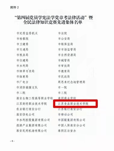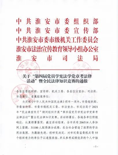 近日,淮安市法治宣传教育领导小组办公室等五部门联合印发《关于“第四届党员学宪法学党章考法律”暨全民法律知识竞赛的通报》,永利官网获评先进集体。