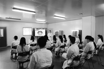 ◀学生正在校企共建的GMP教学工厂进行药物制剂实训