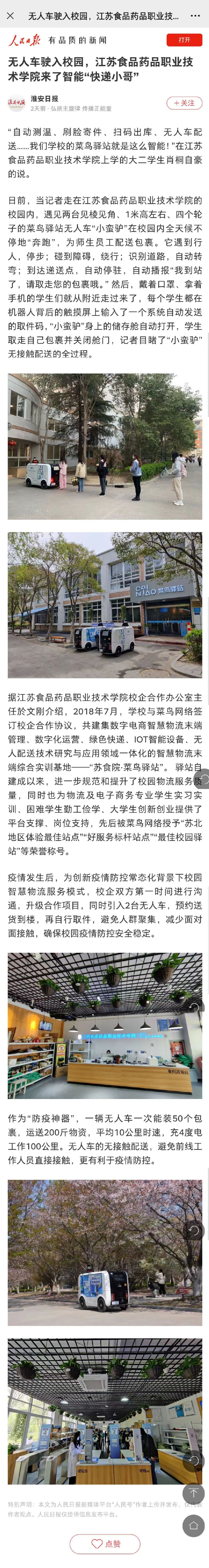 疫情发生后,为创新疫情防控常态化背景下校园智慧物流服务模式,校企双方第一时间进行沟通,升级合作项目,同时引入2台无人车,预约送货到楼,再自行取件,避免人群聚集,减少面对面接触,确保校园疫情防控安全稳定。