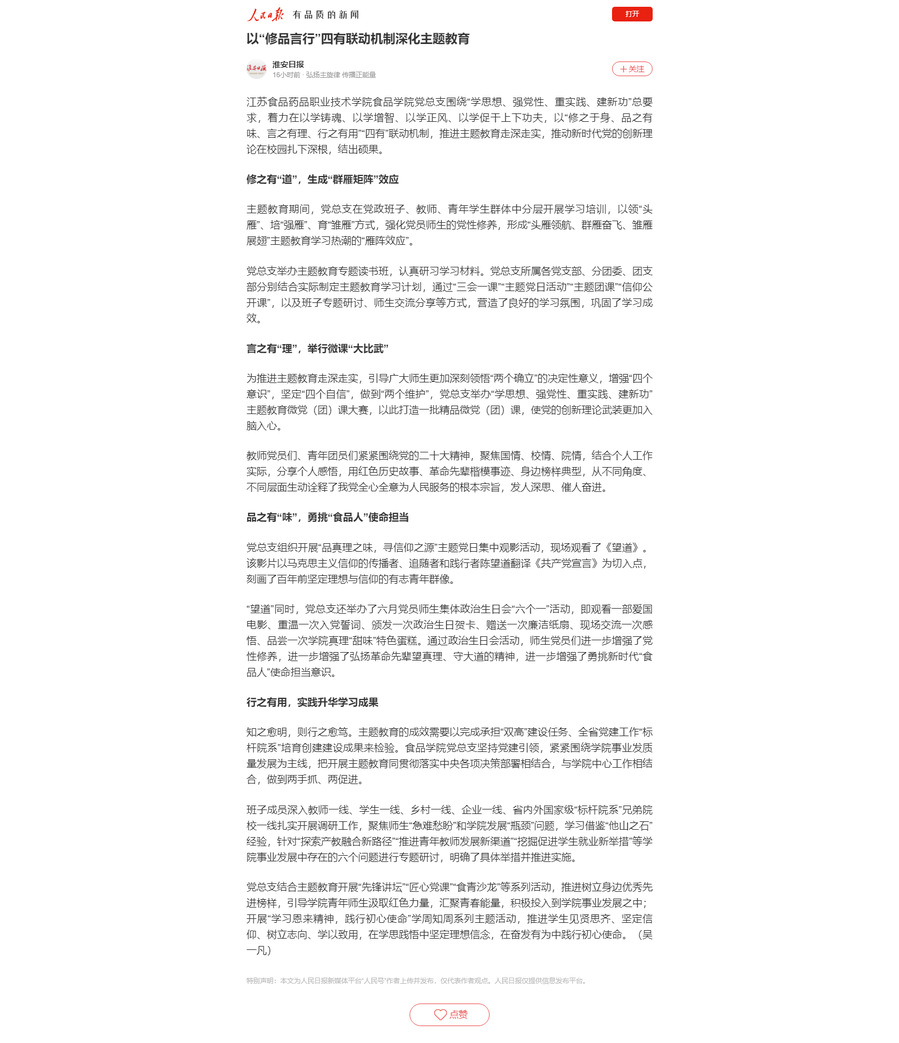 yl23455永利官网食品学院党总支围绕“学思想、强党性、重实践、建新功”总要求,着力在以学铸魂、以学增智、以学正风、以学促干上下功夫,以“修之有道、品之有味、言之有理、行之有用”“四有”联动机制,推进主题教育走深走实,推动新时代党的创新理论在校园扎下深根,结出硕果。