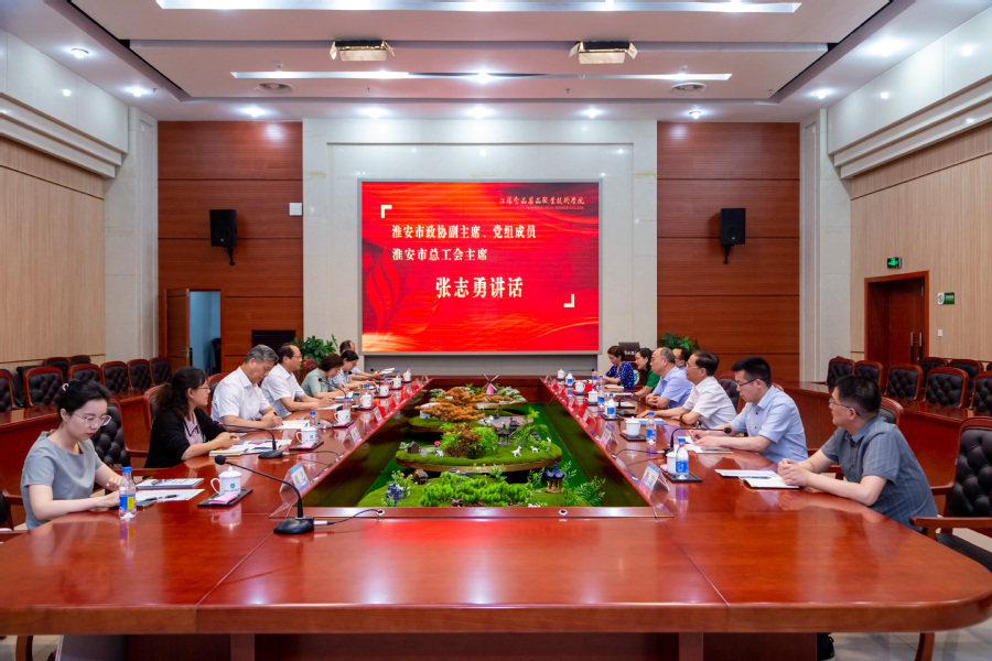 6月25日下午,淮安市政协副主席、党组成员,市总工会主席张志勇一行来永利官网送奖,校党委书记陶书中、校长薛宇、副校长张建华热情接待了来宾。