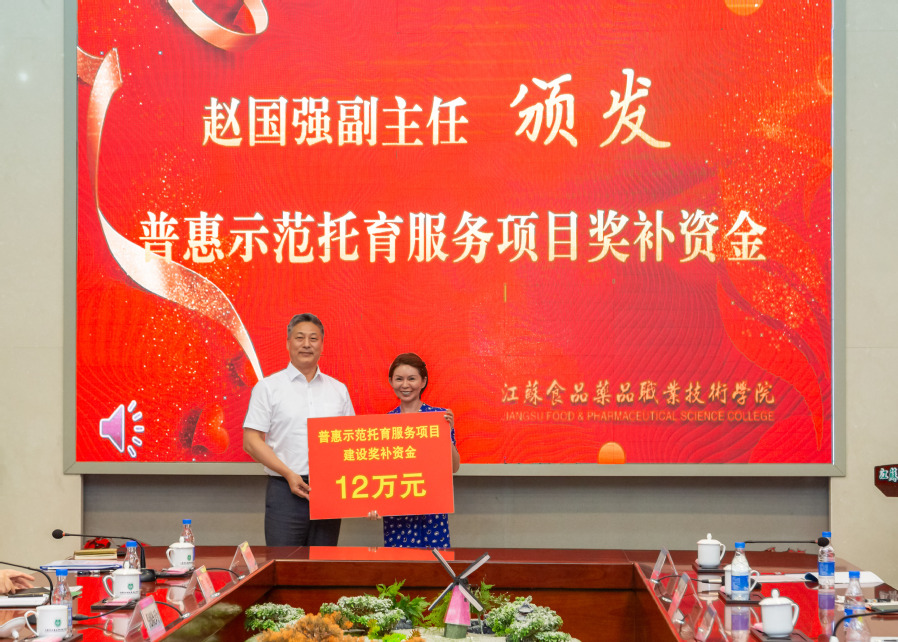 淮安市卫健委党委委员、副主任赵国强向Ebaby托育中心颁发普惠示范托育服务项目奖补资金12万元。