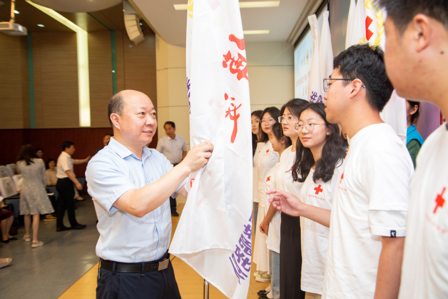 6月27日上午,2023年驻淮高校红十字会“博爱青春”暑期志愿服务项目启动仪式在永利官网图书馆报告厅举行。市红十字会党组书记、常务副会长张柏,yl23455永利官网副校长安进,市文明办、团市委等7家主办单位和学校相关职能部门有关同志参加了活动。现场七家主办单位为志愿服务队授旗。