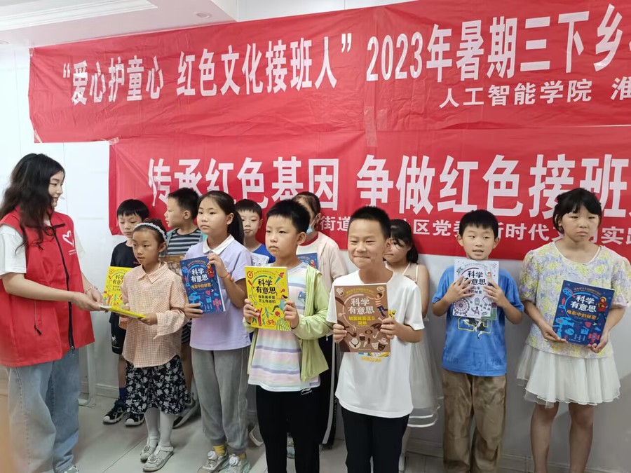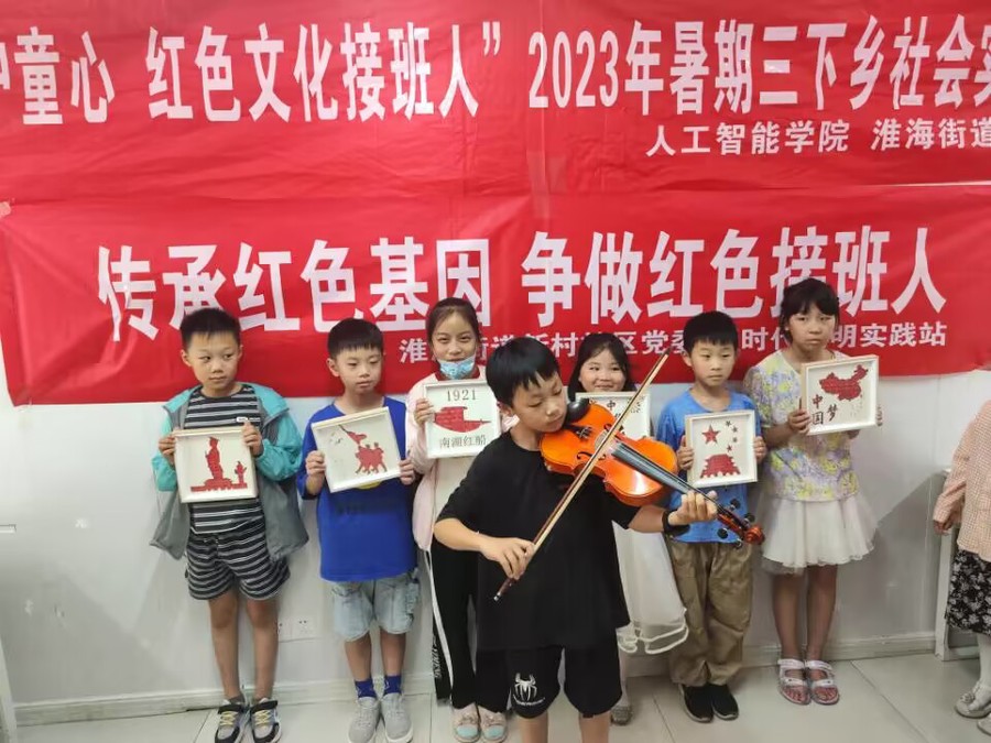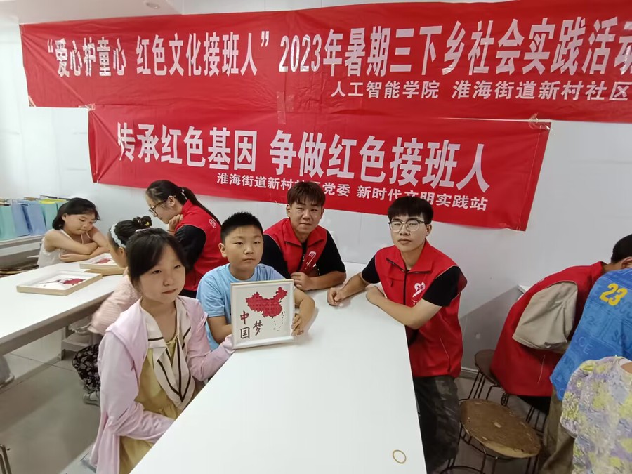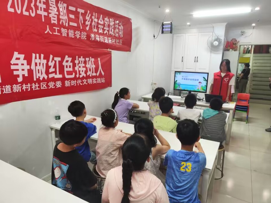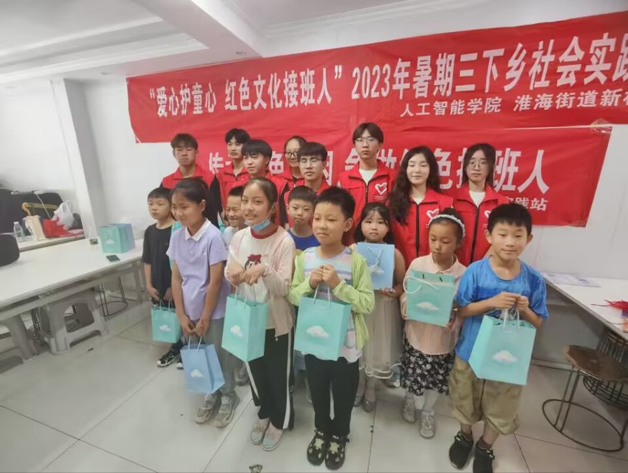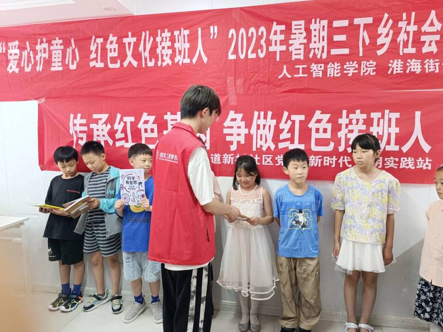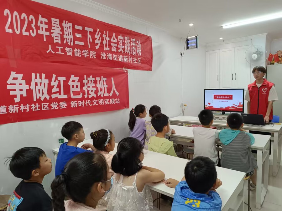 7月13日,人工智能学院暑期社会实践团走进淮海街道新村社区,关爱留守儿童,以“爱心护童心 红色文化接班人”为主题,开展暑期三下乡社会实践系列活动。
