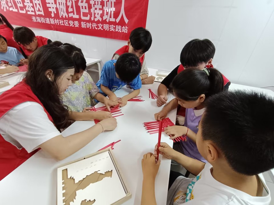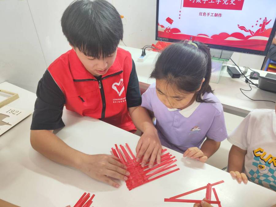 暑期实践团积极与淮海街道新村社区进行线上和线下对接,将经济困难家庭和留守儿童家庭的孩子组织起来开展了一对一教育帮扶,精心挑选书籍,捐赠儿童读物,向小朋友赠送精美文具套餐礼包。夏日天气炎热,是儿童溺水事故的易发多发期,实践团成员用心给社区小学生上了一堂防溺水专题教育课,发放防溺水安全倡议书,让孩子度过一个安全快乐的暑假。志愿者和社区儿童还共同开展了巧做手工学党史活动,制作了《1921南湖红船》《中国梦》等竹编手工作品。组织孩子们观看红色动画片《那年那兔那些事》,让红色基因在孩子们心中生根发芽,薪火相传。此外,来自数媒224班的崔文浩向社区儿童讲解了红领巾的相关知识,引导儿童热爱红领巾,珍惜红领巾的荣誉。