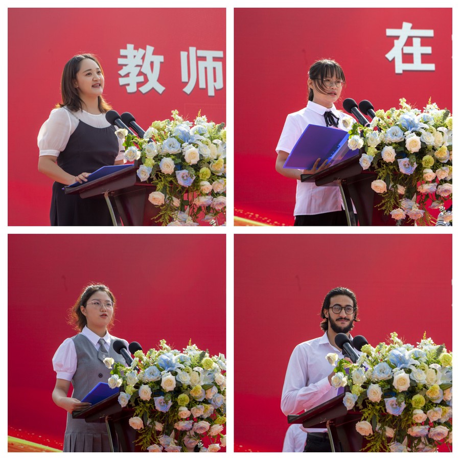 全国职业院校技能大赛团体一等奖获得者、食品学院2021级学生吴子恒同学,新生代表、中医231班王奕玮同学,2023级留学生新生代表苏礼同学,智能制造学院辅导员陶珊老师分别发言。