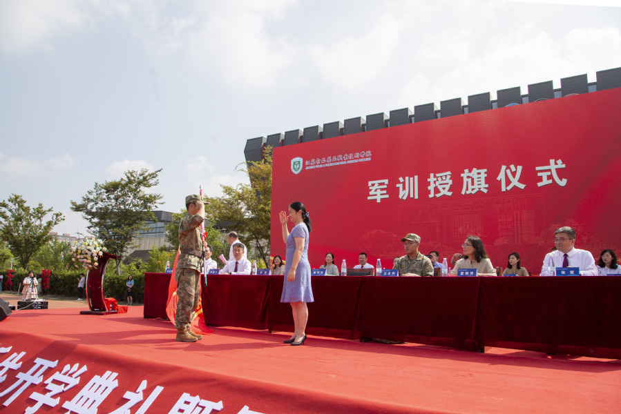 随后,翟玮玮向军训教官代表授旗。