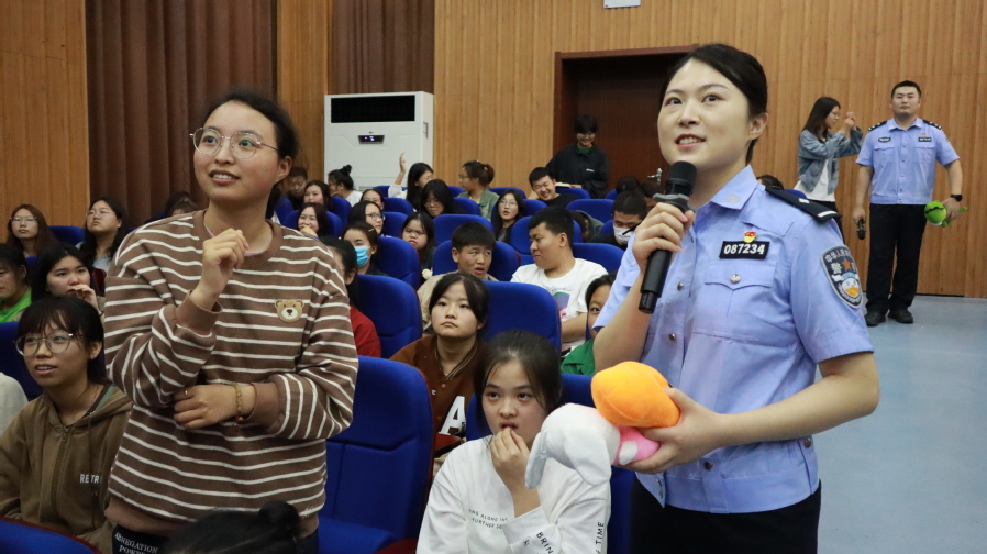 活动伊始,童庆国警官以当前大学生群体中高发频发的“虚假兼职”“虚假客服”“网络刷单”“冒充熟人”等典型案例为切入点,以案释法、以案明理,警示同学们做好网络诈骗的识别与防范。随后,两位警官以相声的表演形式,在“说、学、逗、唱”中道出网络谣言、网络病毒、网络诈骗等行为的危害。最后,为增强反诈意识,提升反诈能力,洪泽湖产业学院工作人员还现场安排了网络安全知识有奖问答,现场气氛热烈。