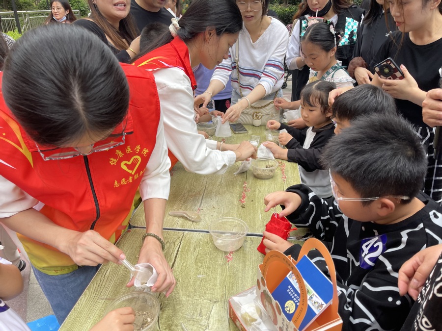 中秋、国庆节前夕、健康医学院、食品学院携手三门社区共同开展巧手做月饼、制香囊活动,除了本次报名参加活动的70余组家庭外,还吸引到了其他社区的小朋友们前来参加。在做月饼环节,大家按照步骤取皮、放团馅,然后整理形状再放入模具,最后轻轻压一压,一款款独特并充满浓浓情谊的月饼就在他们的手中完成了。在制香囊环节,志愿者们准备了艾叶、薄荷、丁香、藿香等中药材,小朋友们将制作香囊的工作台围得水泄不通,一只只香囊在他们灵巧的双手下精彩呈现。活动现场欢声笑语,其乐融融。