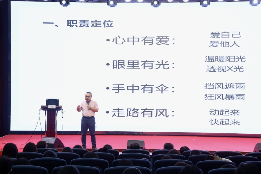 王兆轩老师首先从“心中有爱、眼里有光、走路带风、光芒万丈”四个维度介绍了班级心理委员的职责定位,其次从心理普测、心理困扰和心理危机三个方面进一步梳理了班级心理委员的工作方法,最后对现场老师在实际工作中遇到的问题进行了解答,帮助其明晰了学生心理危机处理过程中的工作方向和工作流程。