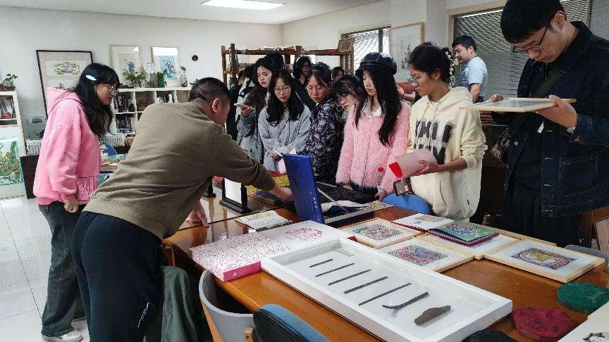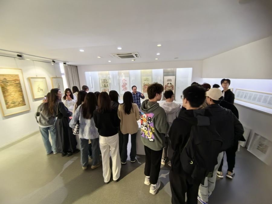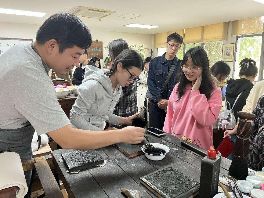 在苏州,师生们至甪直古镇“叶圣陶纪念馆”“沈柏寒故居”等景点,探寻苏式古建筑风貌和古镇深厚的文化底蕴。在拙政园,师生们感受了江南古典园林的造园艺术及手法;在苏州市博物馆(本馆),师生们不仅参观了贝聿铭先生的建筑设计,还欣赏了丰富的文物和艺术品,了解了各时期苏州社会发展与文化繁荣,并通过互动式展览形式深刻体会到数字艺术给博物馆带来的新力量。在诚品书店,师生们欣赏了琳琅满目的文创精品,并对一些优秀作品进行了拍摄,体会创意设计的无限魅力;在苏州工艺美术学院桃花坞木刻年画社,师生们感受了中国四大年画之一桃花坞木版年画承载的历史底蕴与独特艺术魅力,学习了绘画、雕刻技巧等理论知识并进行了实操体验,共探非遗文化。
