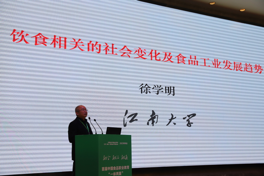 开幕式结束后,江南大学教授、博士生导师、国家功能食品工程研究中心常务副主任徐学明教授以《饮食相关的社会变化及食品工业发展趋势》为主题,国家“双高”校建设专家咨询委员会委员、长三角产教融合与职业教育发展研究院执行院长、浙江工业大学职业教育研究所所长、博士生导师陈衍教授围绕《以高质量产教融合推进技能型社会体系建设》,先后带来中国食品产业研究、职业教育产教融合发展方面的专家报告。