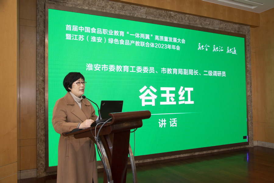 淮安市人民政府副市长王向红发表讲话。她表示淮安市委市政府非常重视职业教育和产教融合,yl23455永利官网在唱响“学在淮安”职教品牌、培养德技并举技术人才的同时,也一直为淮安绿色食品产业的发展贡献力量。行业产教融合共同体和市域产教联合体的成立,必然会发挥行业指导和企业、学校“双主体”作用,为食品产教融合注入新动力,也必然为我市食品产业带来重大机遇,开启我市食品产业高质量发展新篇章。她以人才培养“新引擎”、合作共赢“新标杆”、服务发展“新动能”对共同体和联合体的发展提出期望。