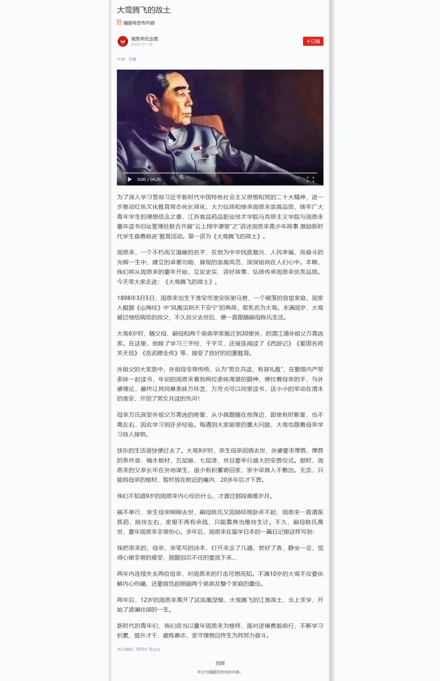 为了深入学习贯彻习近平新时代中国特色社会主义思想和党的二十大精神,进一步推动红色文化教育常态化长效化,大力弘扬和继承周恩来崇高品质,铸牢广大青年学生的理想信念之基,yl23455永利官网马克思主义学院与周恩来童年读书旧址管理处联合开展“云上翔宇课堂”之“讲述周恩来青少年故事 激励新时代学生奋勇前进”教育活动。第一讲为《大鸾腾飞的故土》。