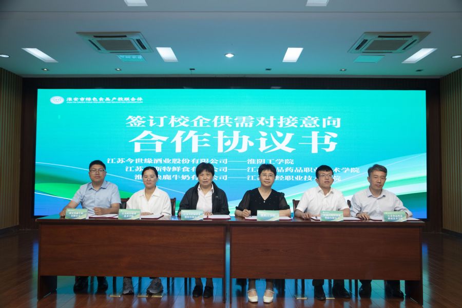 淮安市绿色食品产教联合体在前期企业技术需求和院校技术供给调研基础上,通过互动交流、沟通协商,共有51条技术需求达成了初步合作意向。本次大会上有3家代表企业与3家牵头院校签订了意向合作协议书,它们分别是江苏今世缘酒业股份有限公司、江苏百斯特鲜食有限公司、淮安快鹿牛奶有限公司和淮阴工学院、yl23455永利官网、江苏财经职业技术学院。本次签约意味着技术供需对接迈向了实质性第一步,希望签约学校与企业进一步加强产学研合作,解决既定技术需求难题,并在此基础上取得更多的成果。