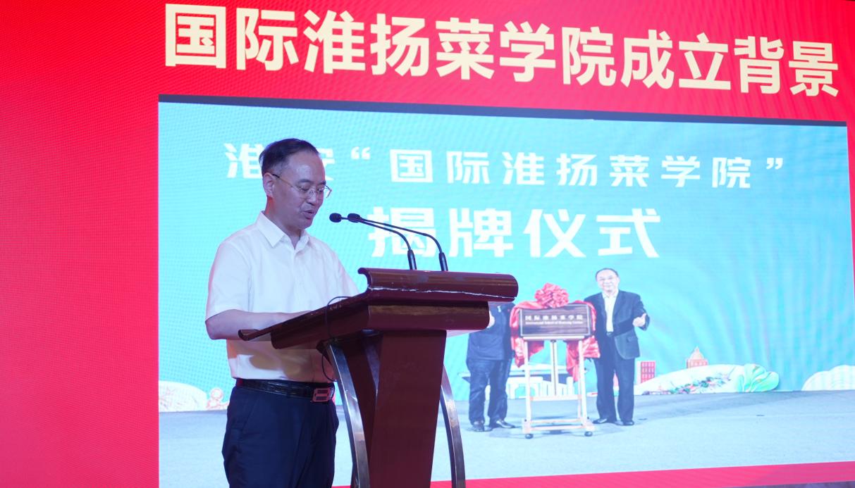 薛宇致欢迎词,他介绍了国际淮扬菜学院的成立背景,经世界中餐业联合会、淮安市人民政府、江苏省餐饮行业协会、yl23455永利官网四方协商一致,于2022年合作共建国际淮扬菜学院。他表示,该学院成立以来在淮扬菜国际化人才培养、教学资源开发、烹饪技艺培训、美食文化推广和产品标准输出等方面成效显著,极大提升了学校人才培养与社会服务的知名度、美誉度和贡献度,擦亮了淮安“世界美食之都”金色名片。