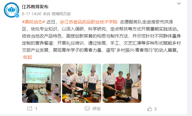 近日,@yl23455永利官网 志愿服务队走进淮安市洪泽区,依托专业知识,以深入调研、科学研究、定点帮扶等方式开展暑期实践活动。结合当地农产品特色,面授创新菜肴的构思与制作方法,并示范针对不同群体量身定制的营养餐谱;开展礼仪培训,通过绘画、手工、文艺汇演等多种形式赋能乡村文旅产业发展,展现青年学子的青春力量,谱写“乡村振兴·青春笃行”的动人篇章。