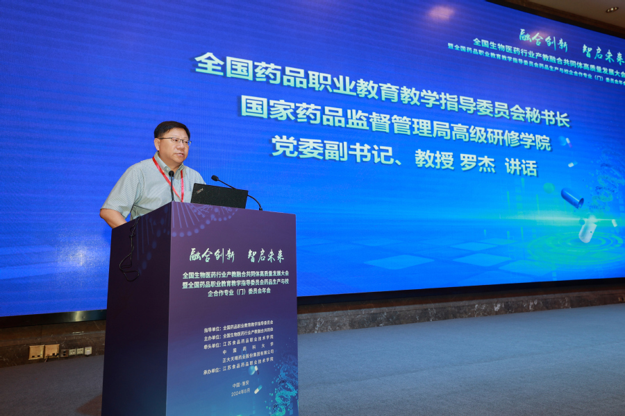 全国药品职业教育教学指导委员会秘书长、国家药品监督管理局高级研修学院党委副书记罗杰致辞
