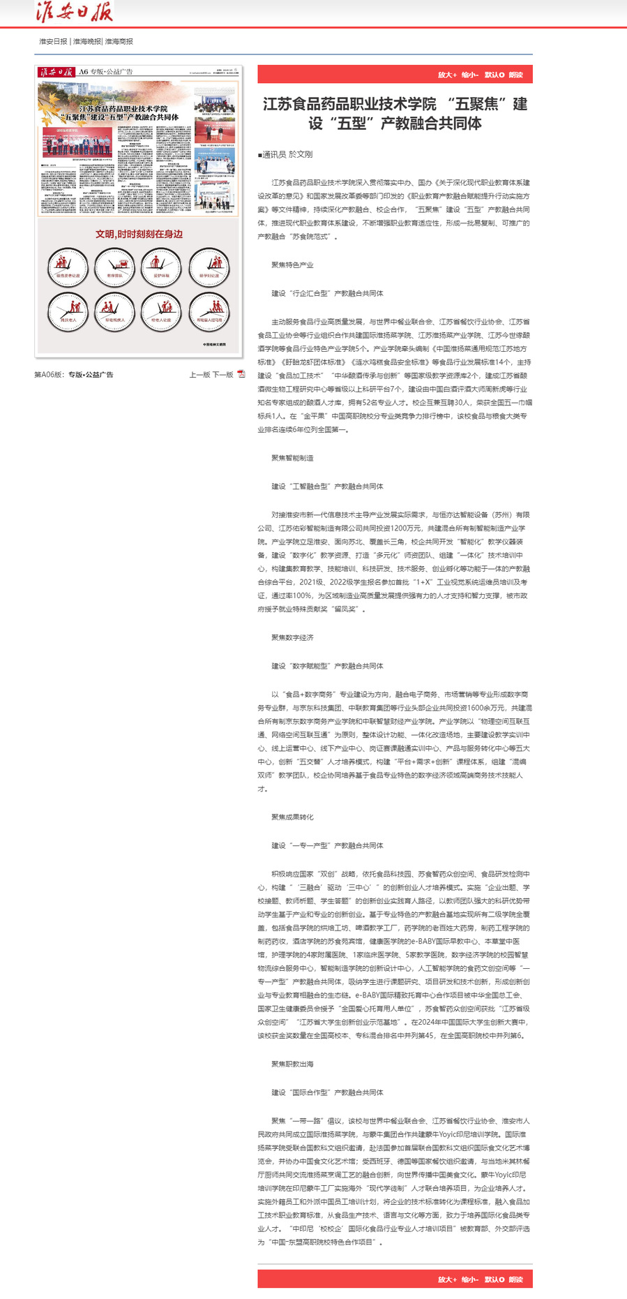 江苏食品药品职业技术学院深入贯彻落实中办、国办《关于深化现代职业教育体系建设改革的意见》和国家发展改革委等部门印发的《职业教育产教融合赋能提升行动实施方案》等文件精神,持续深化产教融合、校企合作,“五聚焦”建设“五型”产教融合共同体,推进现代职业教育体系建设,不断增强职业教育适应性,形成一批易复制、可推广的产教融合“苏食院范式”。