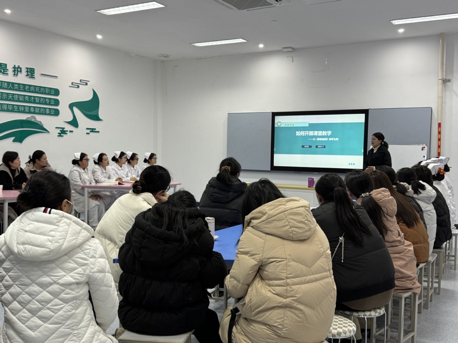 在专业研讨环节,护理教研室副主任张玉红开展教学讲座,护理专业教师陆舒婷进行教学展示,与会教师进行了观摩。随后,《内科护理》、《外科护理》、《综合护理实训》等课程组分组围绕教学策略、教学方法、课程建设等开展了研讨。